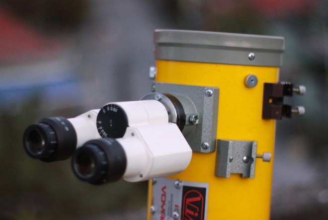 I attached a binocular eyepiece (or binoviewer) repurposed from an old microscope to a reflecting telescope. A beam splitter prism splits the light and send it to two eyepieces. The image viewed on each eyepiece will be less bright (half brightness), but since both eyes see the image, the view appears to have an enhanced perception of depth.