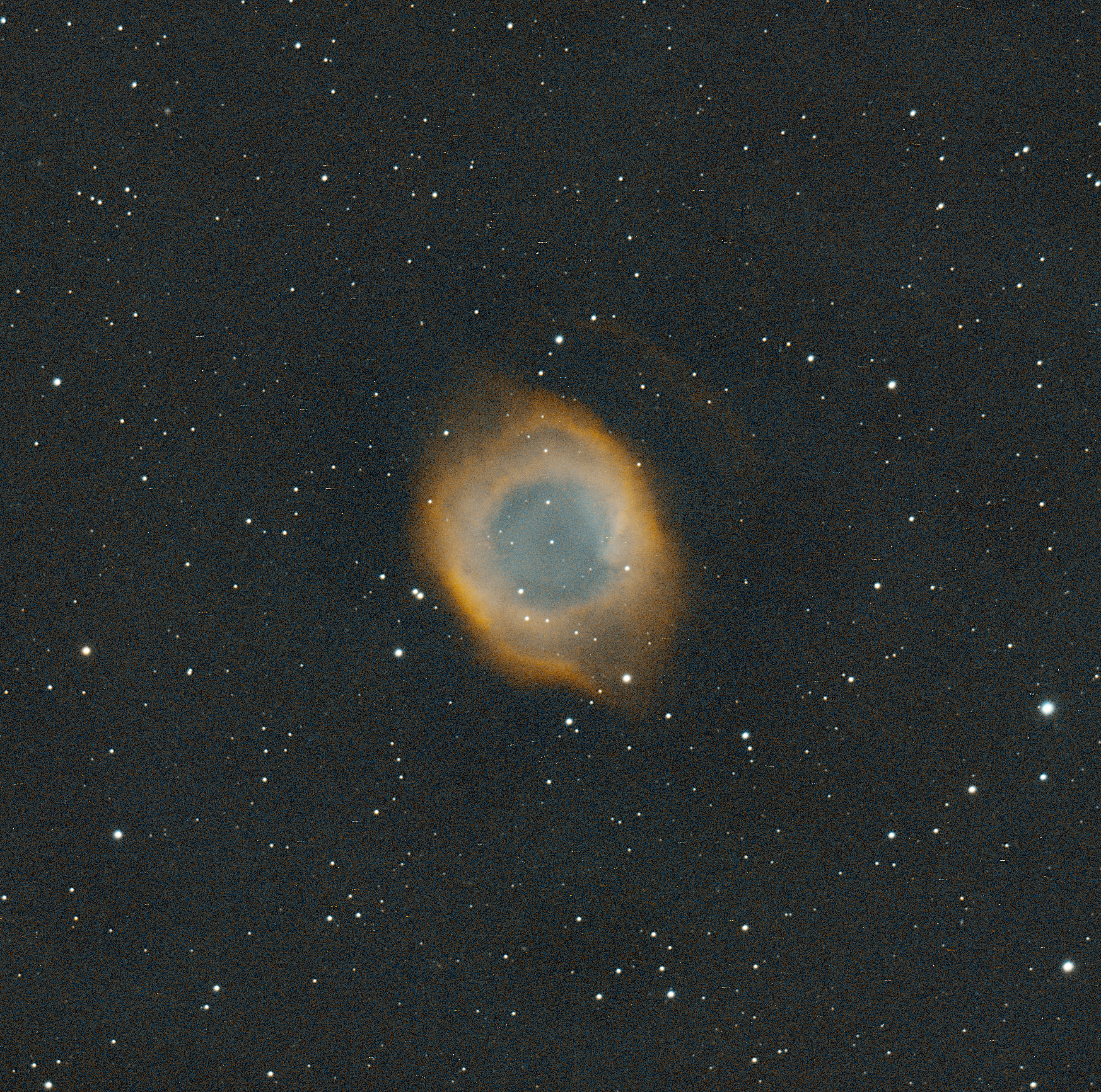 Helix Nebula imaged with a modified Sky-Watcher Equinox 100ED, ZWO duo nebula filter, and an ASI 533 astronomy camera at 608 mm focal length using a 0.67x DIY focal reducer, guided with a 50 mm guide scope and an ASI 174MM guide camera.