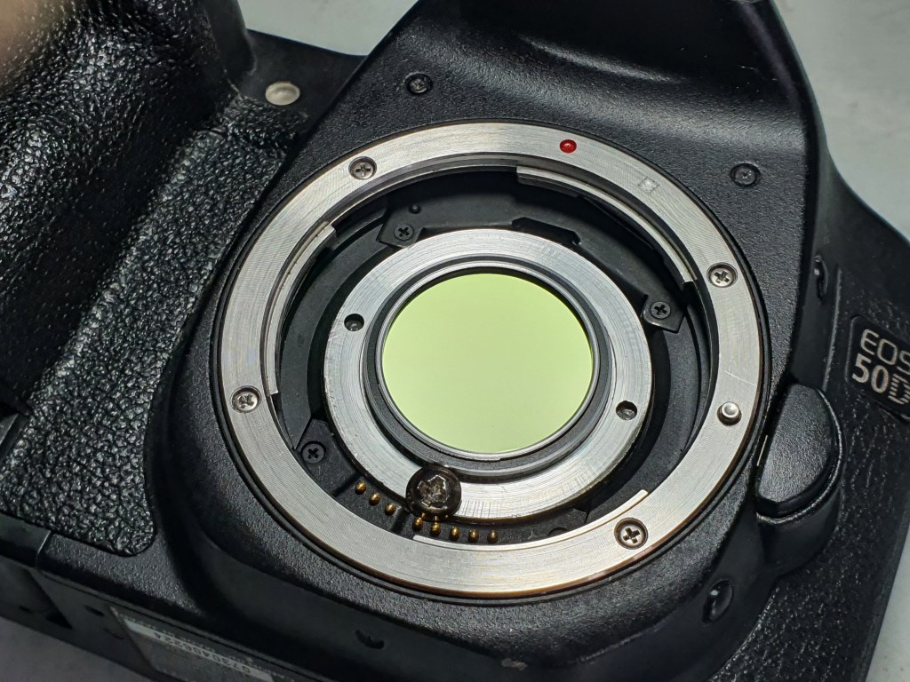 I have built a DIY clip-in filter holder for use with my DSLR. I used a spare T2 to 1.25 inch adapter supplied with my astronomy camera. I noticed that my Canon 50D has space to accommodate this adapter. I then drilled a small hole in the camera and used a small screw to fasten the DIY clip-in filter in place.