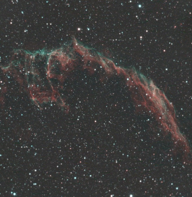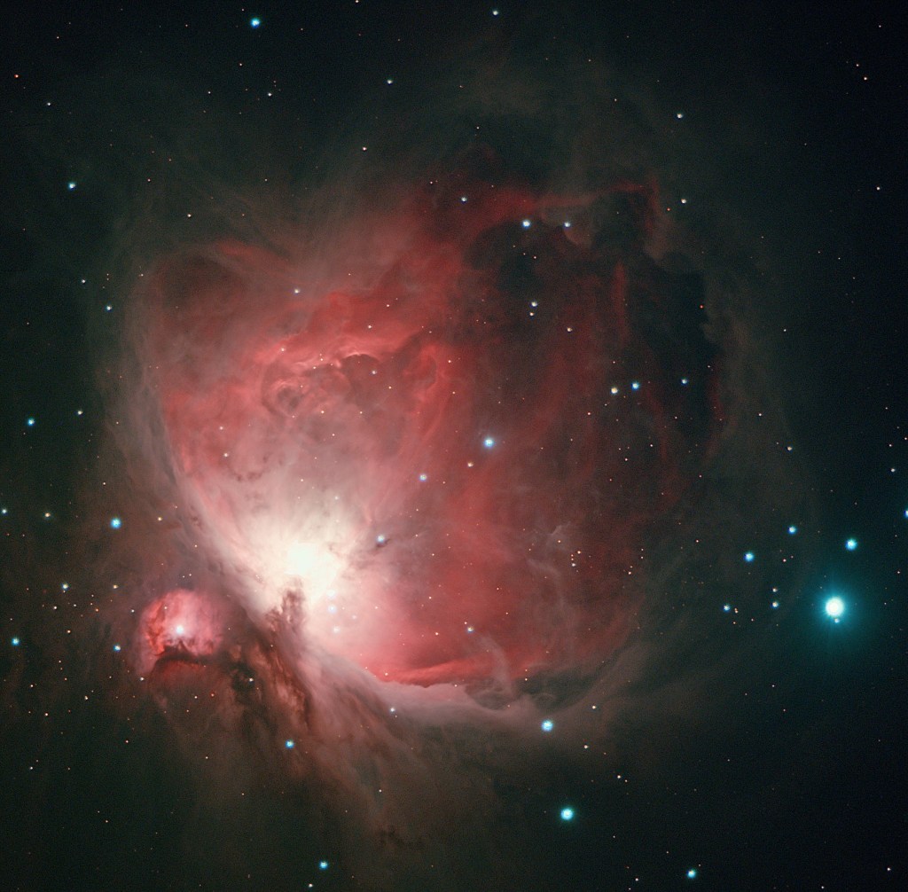 Orion Nebula M42 imaged in 5 different sessions from 2023 to 2025, with a 4 in refractor at 557 mm focal length, an ASI 533MC cooled astronomy camera, dual band H-alpha and O-III filter, with an LXD75 mount and an ASI 174MM guide camera. This image was taken with a DIY focal length reducer.
