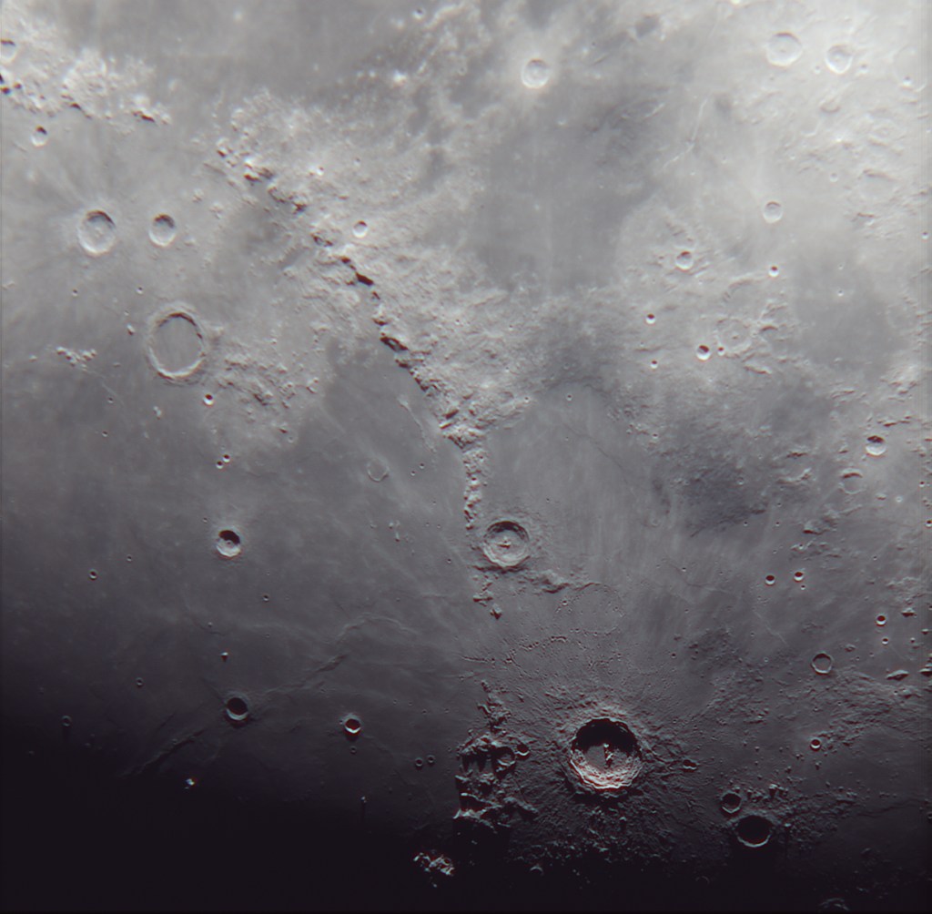 Clavius crater imaged with a Sky-Watcher 4 in f/9 refractor, 25 mm eyepiece, and an ASI 533 camera. Registering and stacking done in SIRIL.