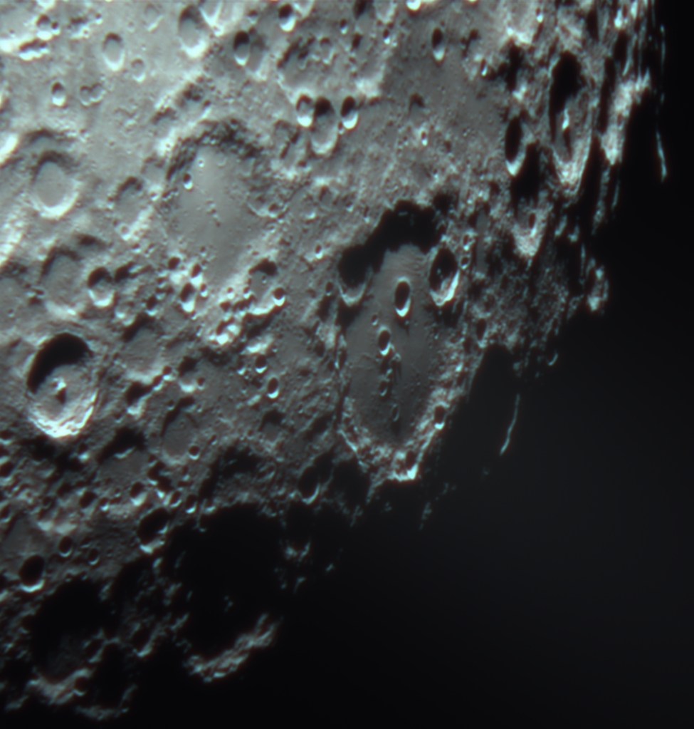 The moon imaged with an 8 in SCT with 0.75x DIY reducer and a Canon 50D camera. Registering and stacking done in SIRIL.
