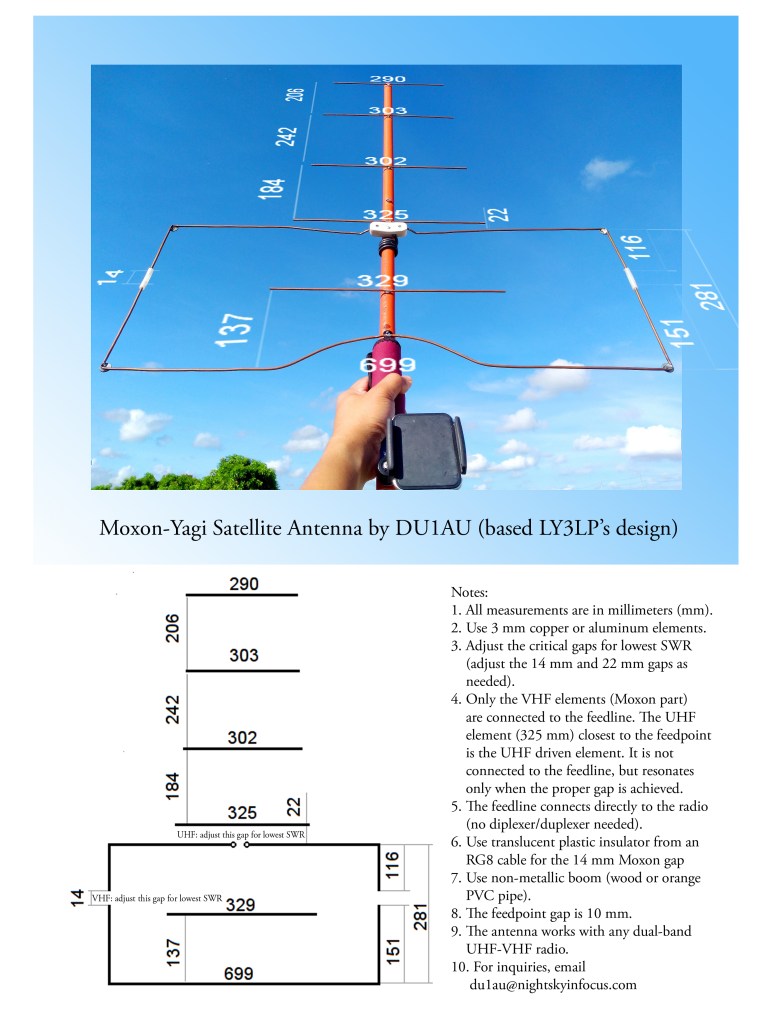 A satellite antenna can be made from 3 mm copper or aluminum elements, PVC boom, and some parts you may already have at home. This antenna has been tested to work with the Philippine Oscar (PO)-101 satellite Diwata 2.