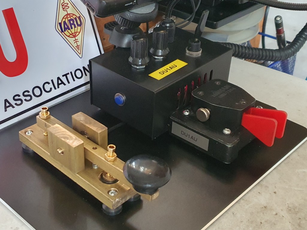 I have built a Morse code straight key and iambic keyer for Morse code communications. The straight key was made from brass bars, some bearings, and screw. It was then mounted on the same aluminum plate with my home-brewed electronic keyer with paddles and desk microphone.