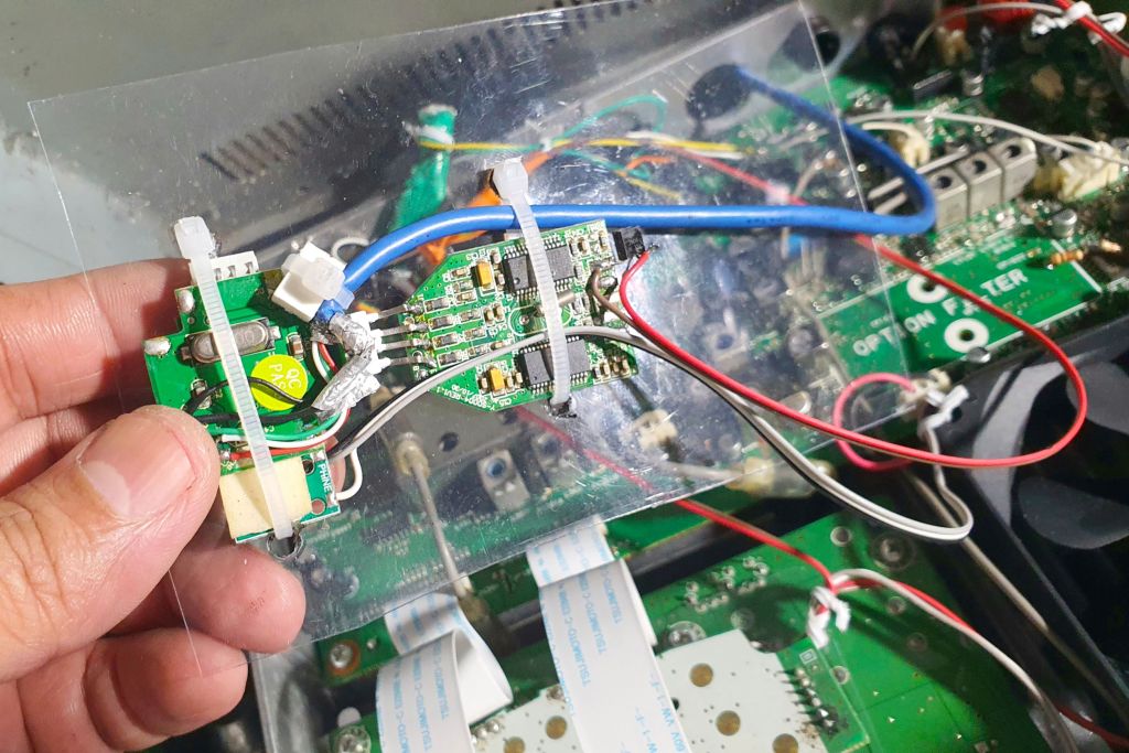 The circuit board of the USB sound card and the USB-to-serial adapter are then removed from their housing and soldered directly on to a USB hub. This configuration allows both modules to work with just one USB port of the laptop. I then put everything inside the metal casing of the radio, in a section protected from radio interference. To operate in digital modes, I only need to connect one USB cable from the radio.