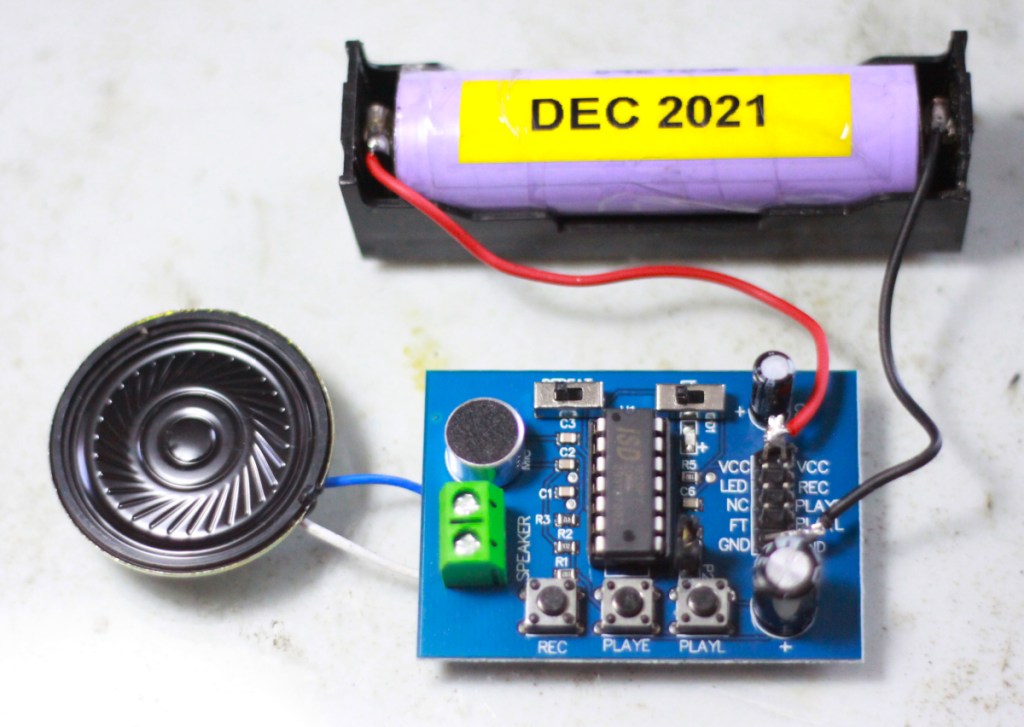 The ISD1820 is a sound recorder and playback module capable of storing 20-second audio recordings. It features the ability to initiate playback with a button press or a pulse, which is very useful in automated transmissions. The playback signal can be generated manually by tapping the playback button onto a radio’s PTT button, or by using a dedicated controller (such as a timer or an Arduino) for sending transmissions at regular intervals. To send the module’s audio signal to a radio transmitter such as a VHF radio on FM mode or an HF radio on SSB, connect the speaker out to the microphone line input of the radio. This module can be used to send repeated transmissions such as station IDs or for calling a CQ.