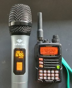 I noticed that this particular model of a wireless microphone (Kevler) displays the frequency at which it operates. It transmits signals on to a receiver dongle, which then connects to an amplifier as part of a wireless microphone setup. The microphone has a button to toggle between 30 pre-programmed frequencies from 670.6 MHz to 699.5 MHz. Realizing that this frequency range is within the receive capability of my Yaesu VX-6R two-way radio, I borrowed the microphone and tested if I could receive its signal. I typed the frequency into the two-way radio and immediately received the microphone’s signal. I found out that the signal is transmitted in FM mode. To watch a video on how I received the signal, click here.