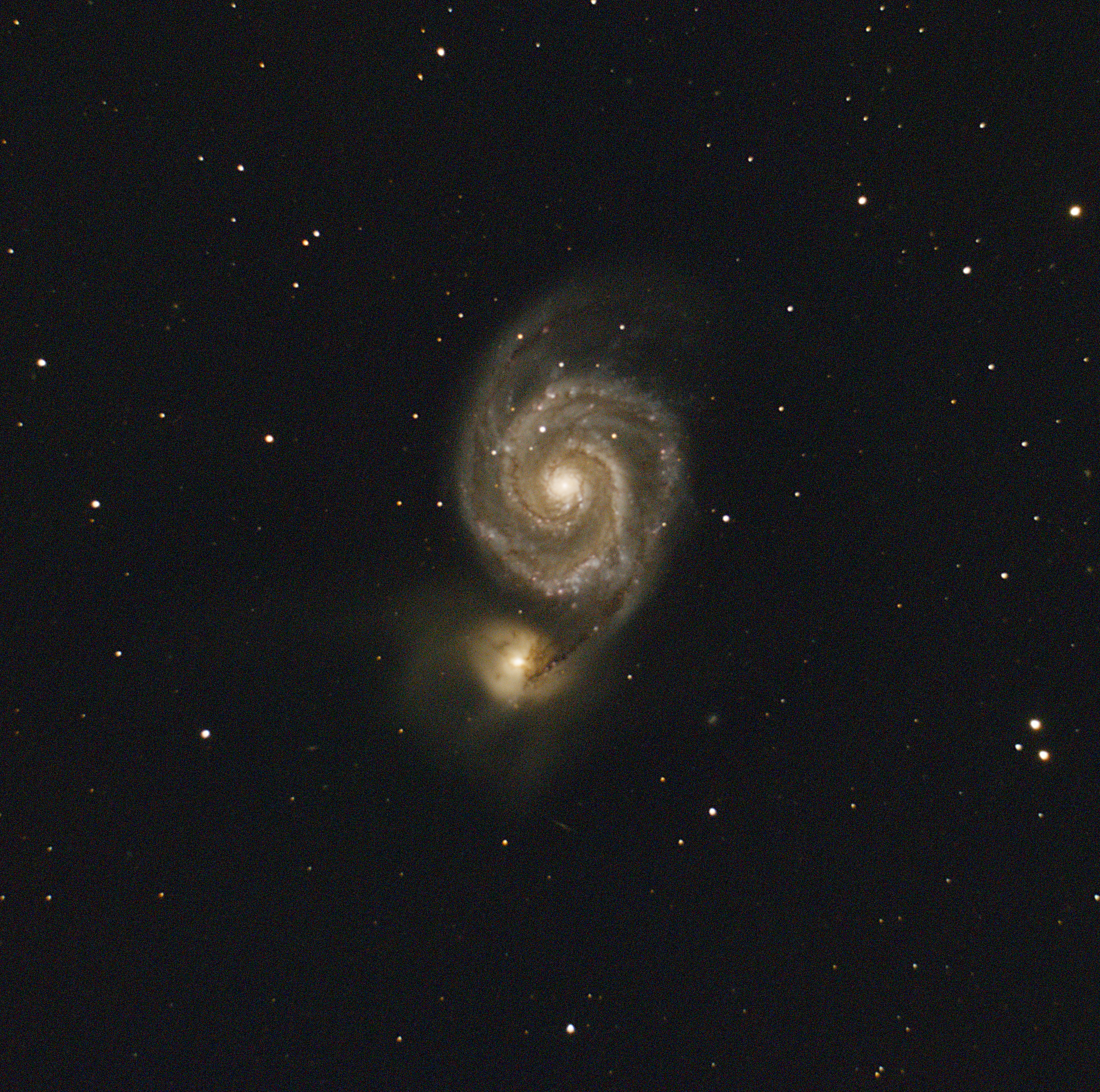 Whirlpool Galaxy M51 imaged with an 8 inch SCT at 1140 mm focal length, an ASI 533MC astronomy camera with UV-IR filter, DIY reducer, and tracked with a restored Meade LXD75 mount. M51 is relatively bright and may be visible through a small telescope. Use the stars of the Big Dipper to find M51.